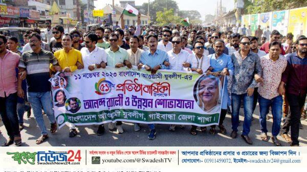 গাইবান্ধা থেকে আঃ খালেক মন্ডলঃ বাংলাদেশ আওয়ামী যুবলীগের ৫১তম প্রতিষ্ঠা বার্ষিকী উপলক্ষে গাইবান্ধা জেলা শাখার উদ্যোগে শনিবার বিভিন্ন কর্মসূচি পালন করা হয়। কর্মসূচির মধ্যে ছিল দলীয় কার্যালয়ে সকাল ৮টায় জাতীয় ও দলীয় পতাকা উত্তোলন, সকাল ৮টা ১০ মিনিটে জাতির জনক বঙ্গবন্ধু শেখ মুজিবুর রহমান ও যুবলীগের প্রতিষ্ঠাতা চেয়ারম্যান শেখ ফজলুল হক মনির প্রতিকৃতিতে মাল্যদান ও দুপুর ১২টায় আনন্দ র্যালি ও উন্নয়ন শোভাযাত্রা।